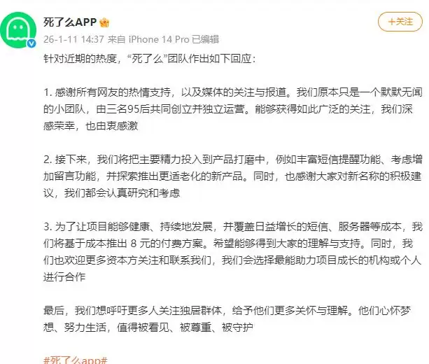 1月11日,“死了么”APP最新微博发文:针对近期的热度,“死了么”团队作出如下回应:1 感谢所有网友的热情支持,以及媒体的关注与报道。我们原本只是一个默默无闻的小团队,由三名95后共同创立并独立