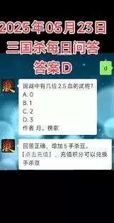 当然,具体的10月11日每日问答答案会因当天的实际题目内容而有所不同。玩家们可以通过在游戏内仔细查看每日问答的题目,结合自己对三国杀规则和武将技能的理解来寻找正确答案。这不仅能增加游戏的趣味性,还能不断提升自己对这款经典桌游的认知水平,在之后的游戏对战中更加游刃有余。
