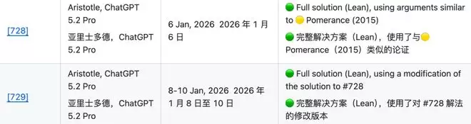 例如,页面列出 #728问题 在2026年1月6日由Aristotle与ChatGPT 5.2 Pro 给出完整解答(Lean验证),#729问题在1月8-10日也获得完整解答(Lean验证)。