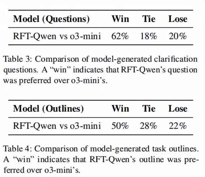 研究结果显示,经过该方法微调的 Qwen-2.5-7B 模型,在自动评估指标上比基线模型 o3-mini 提高了 18%;而在人类评估中,基于该方法生成的澄清问题以及最终大纲分别获得 42% 和 28% 的偏好率。