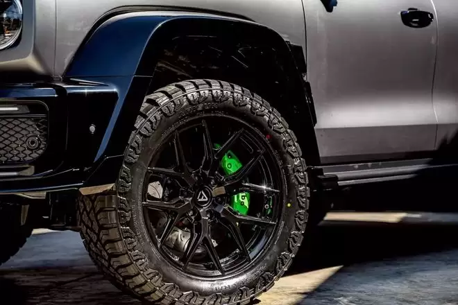 整车搭载 22 英寸改装合金轮毂,匹配厚实的全地形轮胎。买家还可选择升级悬挂系统和更大尺寸的刹车套件。