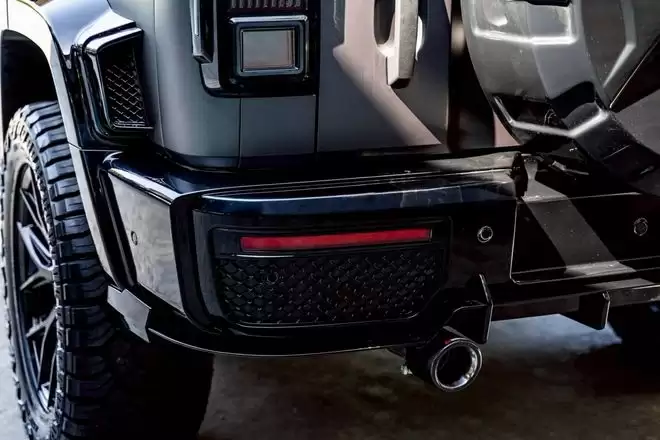 车尾部分,改装厂加装了带一体式扩散器的运动化后保险杠、车顶扰流板和定制备胎罩。根据客户偏好,车辆还可配备四出排气管,或模仿原版 G63 的侧置排气管。