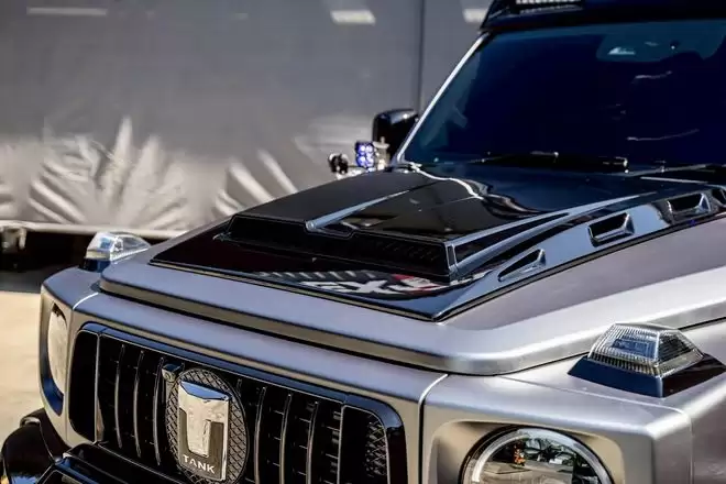 外观的全面改造始于前脸的彻底焕新。原厂坦克 300 的车头被全新设计的前脸取代,新前脸配备了全新格栅、圆形 LED 大灯、带通风口的引擎盖,以及一款运动化保险杠,保险杠上还设有 AMG 风格的进气口和前唇。