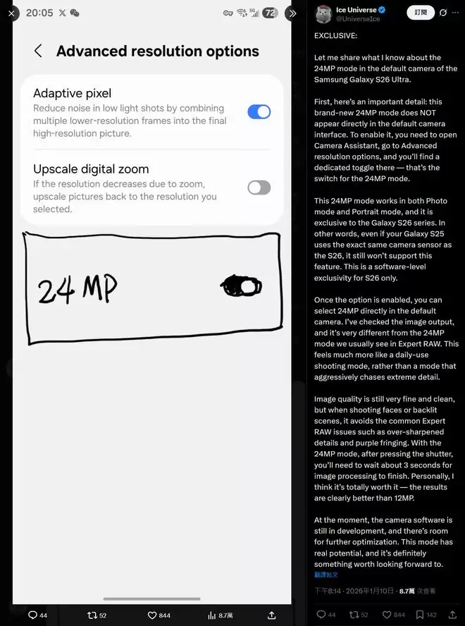 遗憾的是,UniverseIce表示这项新功能将成为Galaxy S26系列的独占特性。即便Galaxy S25系列搭载了同款图像传感器,也将无法支持该模式。