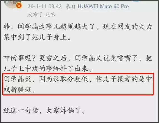 据网友爆料,此前闫学晶曾在直播中公开提到中戏新疆班分数低,她儿子报的新疆班。但按照林傲霏的公开信息,他似乎连进入新疆班的资格都没有。目前相关院校和部门,以及闫学晶都没有回应。