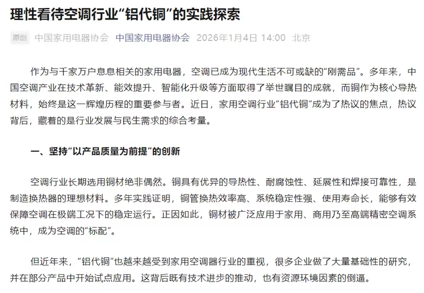近期,随着铜价再次飙升并打破历史纪录,家用空调行业关于“铝代铜”的讨论再度成为焦点。这一热议背后,折射出的是中国家电产业在资源安全、成本控制与技术升级之间的多维权衡。钉科技注意到,中国家用电器协会于