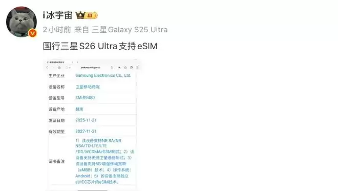 其中没有详细的产品系列信息,但博主@i冰宇宙 认为其是国行版本三星 Galaxy S26 Ultra。同时,认证信息显示这款新机支持 eSIM。