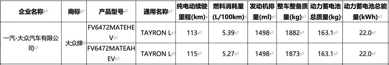 一汽-大众探岳L PHEV常规版申报信息