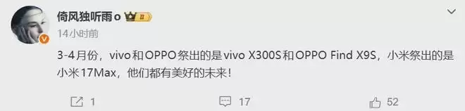 【博主曝小米17 Max等国产新机最早将于3月发布】1月11日,数码博主“倚风独听雨”发文透露,一批国产新机将于今年3月-4月发布,包括vivo X300s、OPPO Find X9s、小米17 Max。同时,该博主表示,小米17 Max采用无背屏设计。此前,数码博主“数码闲聊站”透露,小米17 Max定位“大电池大屏旗舰机”,采用6.8-6.9英寸极窄四等边大直屏,搭载高通第五代骁龙8至尊版平台,号称“全能大屏旗舰”。同时,“数码闲聊站”曾称,OPPO Find X9 Ultra将搭载高通第五代骁龙8至尊版,预计将采用6.3英寸小屏,暂定3月发布。(鞭牛士)