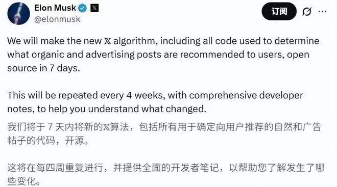 【马斯克:X平台将于一周内开源新算法】马斯克当地时间1月10日在社交媒体平台X发文称,将在一周内正式开源X平台最新的内容推荐算法,覆盖“所有用于决定向用户推荐自然内容和广告内容的代码”。马斯克表示,“此过程将每四周重复一次”,同时附带开发者说明,标注算法和逻辑上的改动内容。(财联社)