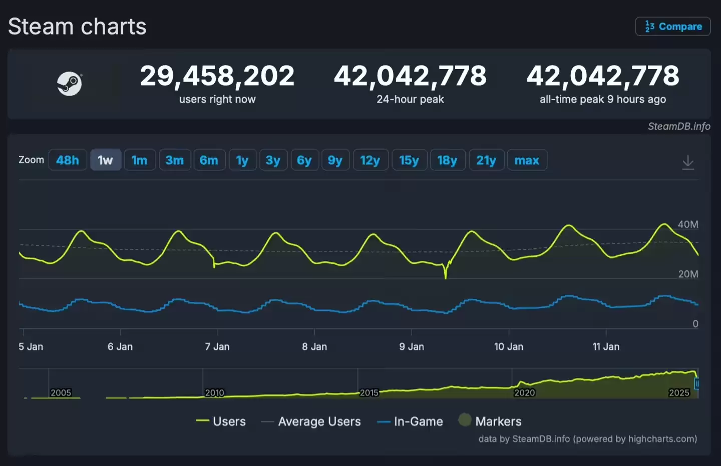 1月12日消息,据SteamDB数据显示,Steam平台在线玩家数量在前一天创下新的历史记录。在长达近24小时的时间窗口内,该平台的并发用户峰值达到了惊人的42,042,778人。