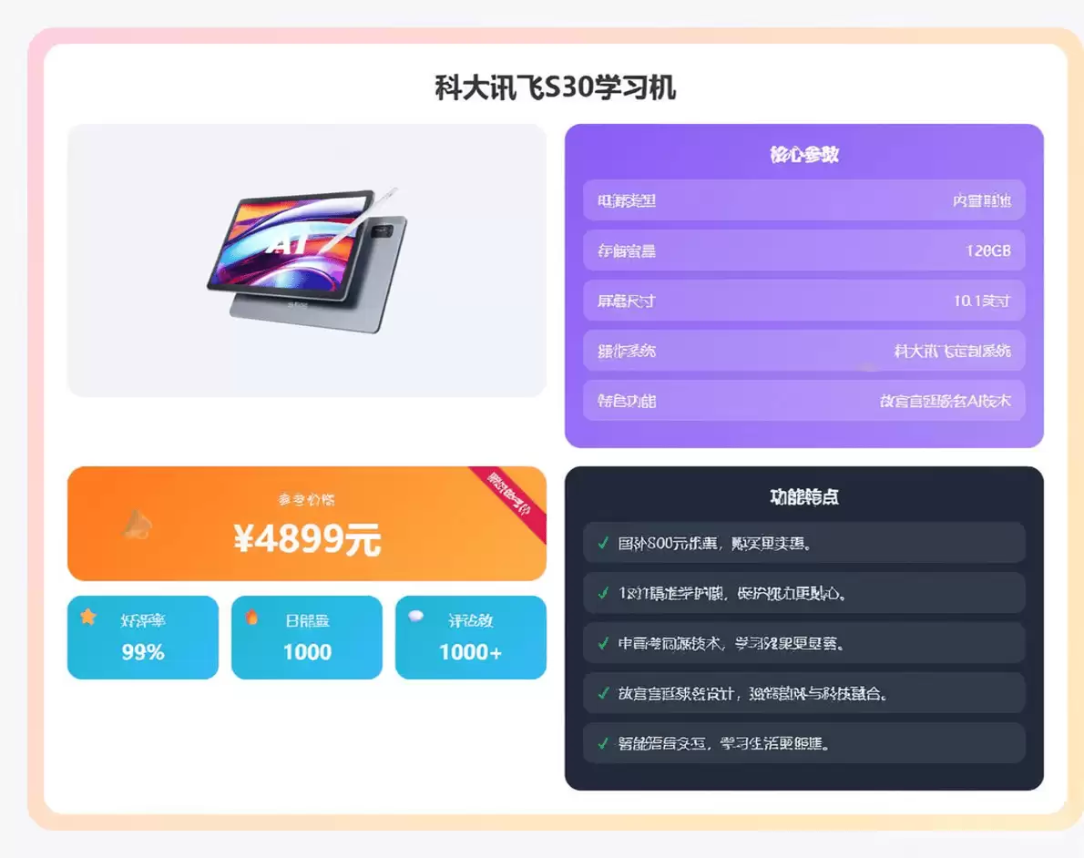 对于预算有限但又希望体验完整AI学习功能的家庭,S30机型堪称性价比之选。这款定价四千元档位的产品,搭载了讯飞核心的“测-学-练”闭环系统,能够精准定位孩子的知识薄弱点并生成个性化学习路径。其配备的高清护眼屏与基础坐姿监测功能,可以很好地满足从小学到高中阶段的课内同步学习需求。虽然它在屏幕素质与运行内存上略逊于高端机型,但核心的AI提分功能已经足够完善,非常适合初次接触智能学习设备的家庭。