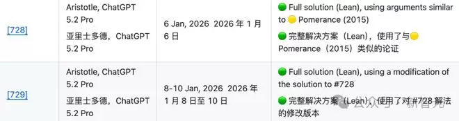 例如,页面列出 在2026年1月6日由Aristotle与ChatGPT 5.2 Pro 给出完整解答(Lean验证), 在1月8-10日也获得完整解答(Lean验证)。