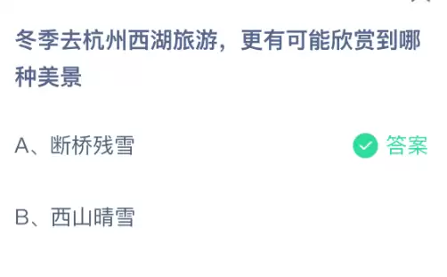 1、冬季前往杭州西湖旅游,更有可能欣赏到哪种美景?