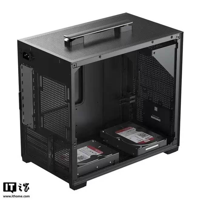 在硬件兼容性方面,该机箱支持 Mini-ITX 和 MATX 规格的主板,并提供了 4 个全高 PCI 扩展槽位。散热限高上,CPU 散热器最高支持 178mm,显卡限长为 330mm。机箱最多可安装 6 把散热风扇,具体分布为:前面板下方可安装 1 把 120mm 或 90mm 风扇,尾部可安装 1 把 120mm 风扇,顶部可安装 2 把 120mm 或 140mm 风扇,底部则可安装 2 把 120mm 风扇。若不安装底部风扇,机箱内部可容纳两块 3.5 英寸硬盘加一块 2.5 英寸硬盘,或同时安装三块 2.5 英寸硬盘。