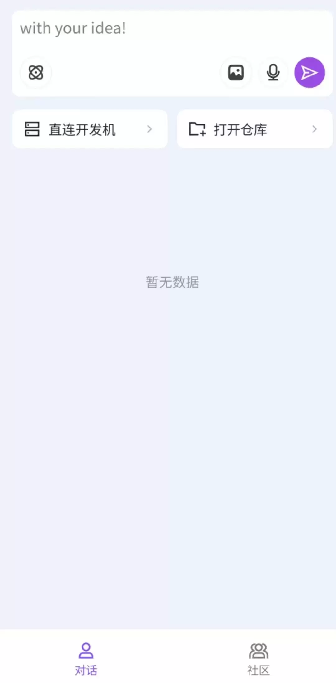 从测试界面来看,“With”平台的交互逻辑高度简化:平台顶部设置了对话输入框,支持文字、语音、图片等多种输入方式,开发者可以直接用自然语言描述开发需求;输入框下方配备了“直连开发机”和“打开仓库”两大核心功能入口。前者用于对接开发环境,后者则支持快速访问代码仓库。