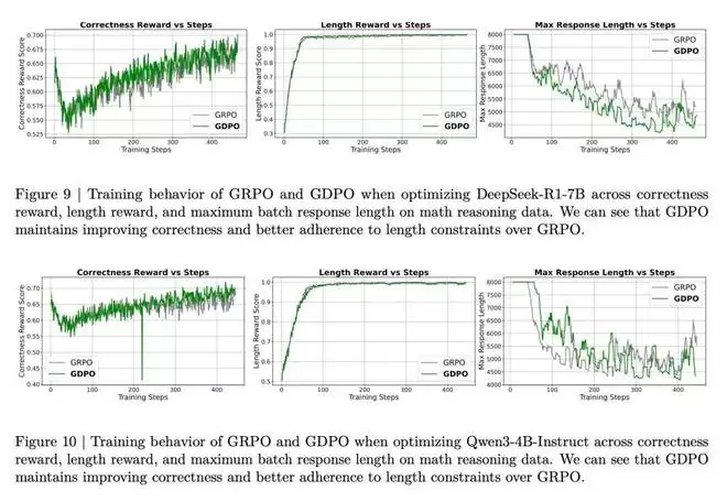 然而,从正确率奖励轨迹来看,GDPO 比 GRPO 更有效地恢复了正确率奖励。作者还观察到 GRPO 训练在 400 步后开始不稳定,正确率奖励分数逐渐下降,而 GDPO 则继续改善。此外,尽管两者都保持了近乎完美的长度分数,但 GRPO 的最大响应长度在约 400 步后开始急剧增加,而 GDPO 的最大响应长度则持续下降。图 9 和图 10 中 DeepSeek-R1-7B 和 Qwen3-4B-Instruct 的训练曲线也显示出类似的观察结果。