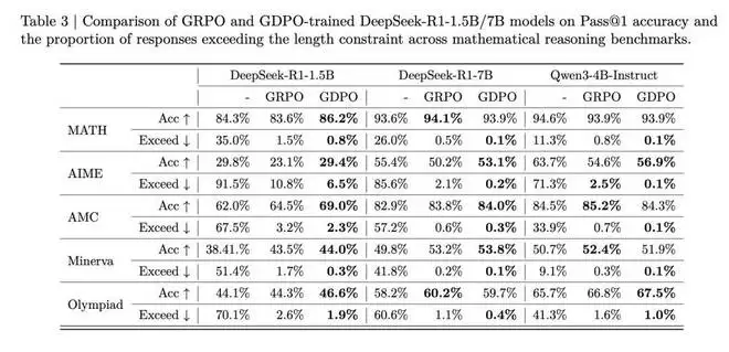 表 3 的基准测试结果表明,GDPO 训练的模型不仅在推理效率上比原始模型取得显著提升(AIME 上超长比例降低高达 80%),而且在大多数任务上也取得了更高的准确率。对于 DeepSeek-R1-1.5B,GDPO 在所有基准测试上都优于 GRPO,在 MATH、AIME 和 Olympiad 上分别取得了 2.6%/6.7%/2.3% 的准确率提升。DeepSeek-R1-7B 和 Qwen3-4B-Instruct 也呈现类似趋势,GDPO 在更具挑战性的 AIME 基准测试上将准确率提高了近 3%,同时将超长率分别降低至 0.2% 和 0.1%。
