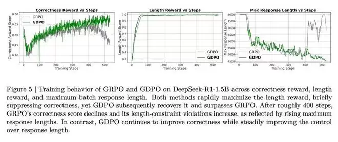 从图 5 中 DeepSeek-R1-1.5B 的训练曲线可以看到,模型倾向于最大化更容易的奖励。在本例中,长度奖励更容易优化,GRPO 和 GDPO 都在大约前 100 个训练步内达到满分长度奖励。长度奖励的快速上升伴随着正确率奖励的早期下降,表明这两个奖励存在竞争关系。