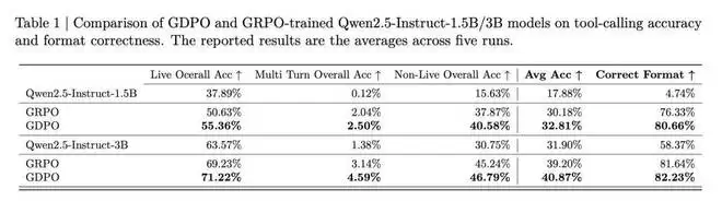 在表 1 的 BFCL-v3 评估中,GDPO 也持续提升了平均工具调用准确率和格式正确率。对于 Qwen2.5-Instruct-1.5B 的训练,GDPO 在 Live/non-Live 任务上分别取得了近 5% 和 3% 的提升,在整体平均准确率上提高了约 2.7%,在正确格式比例上提高了 4% 以上。3B 模型上也观察到类似的改进。