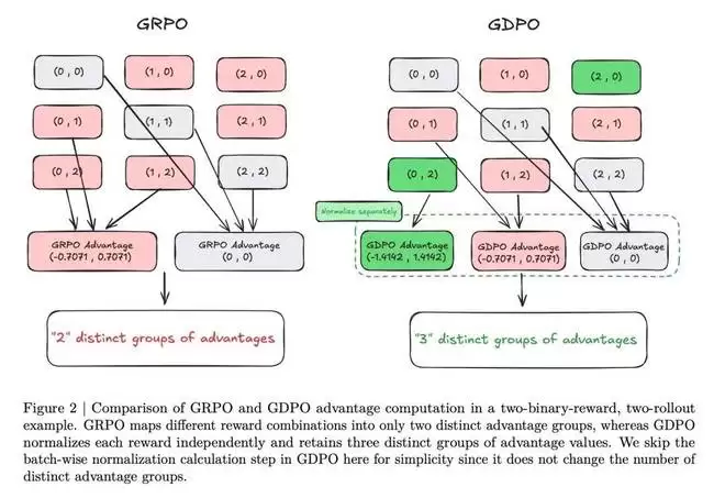 通过分离每个奖励的归一化,GDPO 缓解了 GRPO 优势估计中存在的信息损失问题,如图 2 所示。从图中可以看到,当采用 GRPO 时,不同的奖励组合(如 (0,2) 和 (0,1))会导致相同的归一化优势,从而掩盖了它们之间的细微差异。相比之下,GDPO 通过为每种组合分配不同的优势值来保留这些细粒度差异。