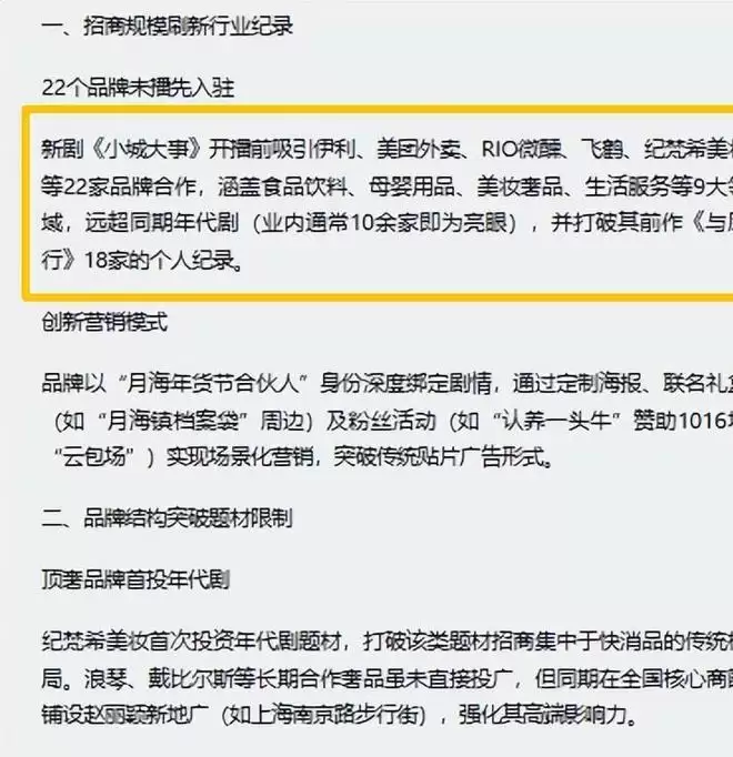 但即便这样,这部剧在商业上取得了成功,首播即吸引美团、元宝等6个品牌合作,创下年代剧招商新高。