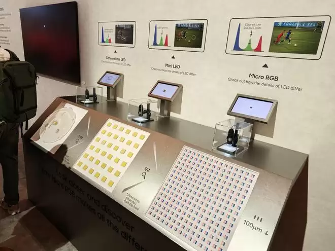 与传统LED电视使用白色或蓝色LED背光不同,Micro RGB采用尺寸小于100微米的红、绿、蓝三色微型LED,每颗LED独立发光。这一先进的显示架构,实现了超精细控光与更高的色彩准确度。