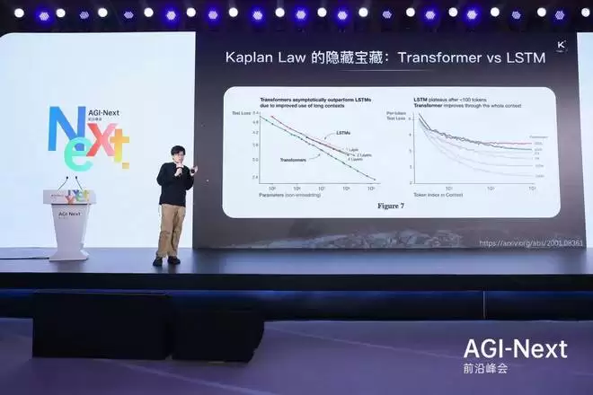 他特别提到了 Kaplan 早期的经典论文,对比了 Transformer 与 LSTM 在 Scaling Law 下的表现。