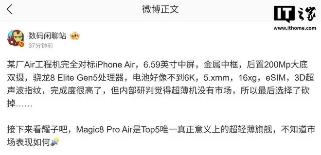 同时博主认为,荣耀的Magic 8 Pro Air是Top 5厂商唯一真正意义的超薄旗舰,不知道市场表现如何。
