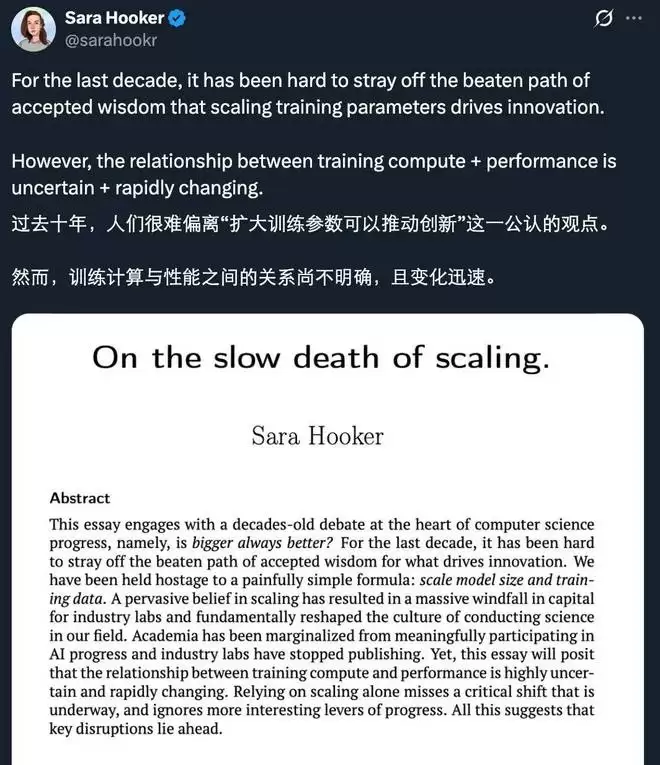 文章标题:On the slow death of scaling.文章链接:https://papers.ssrn.com/sol3/papers.cfm?abstract_id=5877662