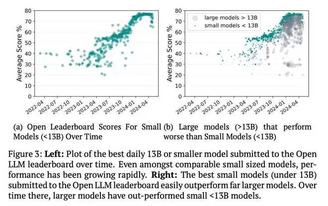 但仅仅依靠计算资源会忽略规模与性能之间的关系正在发生的一个关键转变。更大的模型并不总能带来更好的性能。最近几年出现了很多大模型被规模小得多的小模型超越的案例。如下图 3b 所示,随着时间推移,这类小模型数量激增。