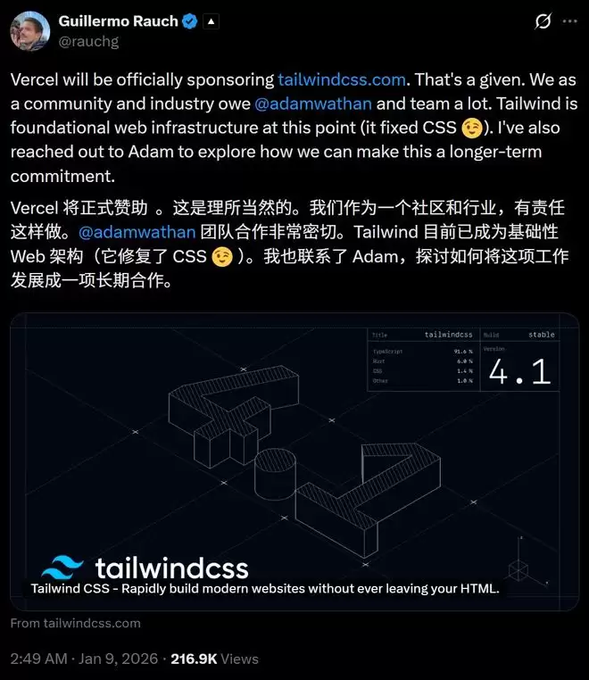 紧接着没过多久,Vercel CEO也宣布,Vercel将正式赞助Tailwind!
