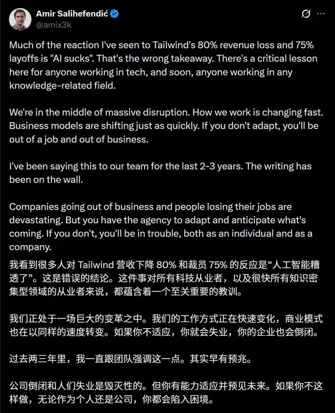 他表示,就在本周一,Tailwind正式裁掉了75%的工程团队。