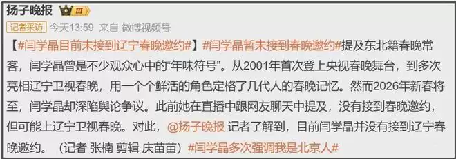 实际上,也有媒体去了解了一下,得到的消息是闫学晶并没有接到辽宁卫视春晚邀约。