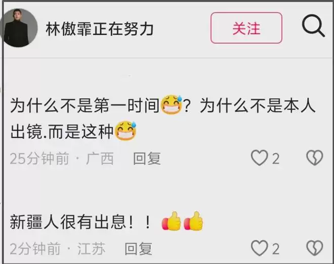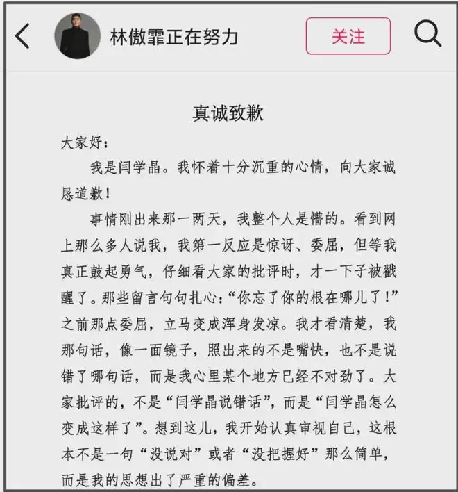 目前闫学晶本人账号被禁止关注,一早通过朋友圈发文道歉,紧接着闫学晶儿子林傲霏公开发布了同一份道歉信,然而网友并不买账,闫学晶儿子账号评论区迅速沦陷。