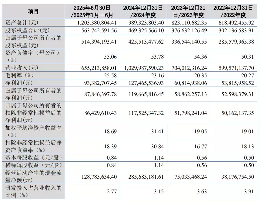 报告期内(2022年至2025年上半年),信胜科技的营业收入分别为6亿元、7.04亿元、10.3亿元和6.55亿元;同期净利润分别为5381.6万元、6081.49万元、1.27亿元和9338.27万元。