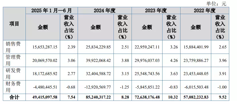 报告期内,公司期间费用占各期营业收入的比例分别为9.52%、10.32%、8.28%和7.54%。2023年期间费用占比较2022年有所提高,主要系销售费用和管理费用增长所致。而2024年及2025年1-6月,期间费用占比有所下降,主要原因是公司营业收入实现了快速增长。