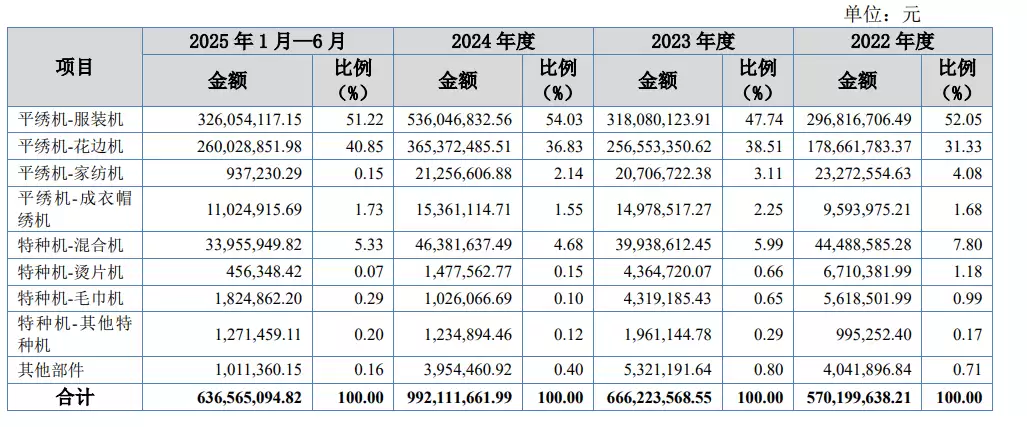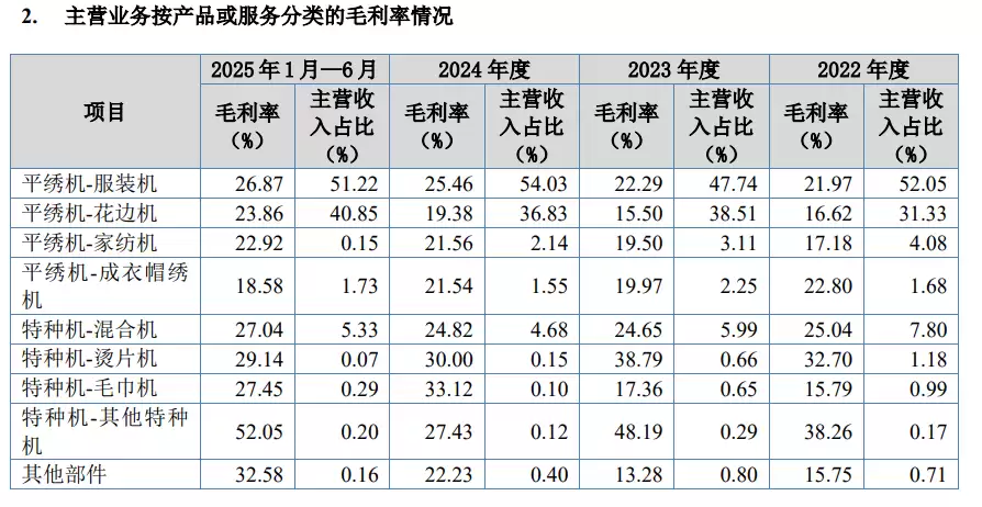 报告期内,平绣机产品收入占公司总收入比重约90%,是公司最主要的收入来源。在平绣机中,又以服装机和花边机两大类机型为主,两者合计收入占主营业务收入的比例超过80%,并且呈现逐年增长态势,显示出公司主要产品收入结构较为稳定。公司其他部件主要包括附加装置、机架、台板等,占收入比重相对较小。