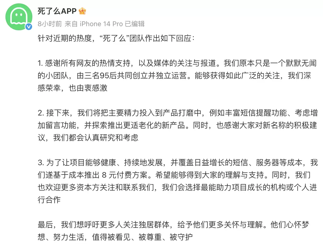 一款名为“死了么”的应用近日在苹果付费软件榜单上迅速走红,引发外界广泛讨论。1月11日,该应用开发团队通过最新微博发布声明,就产品命名、功能升级及商业模式等热点问题作出回应。