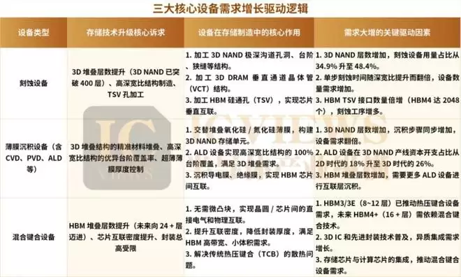其中 3D NAND扩产、DRAM技术演进对刻蚀/沉积设备拉动最强,HBM扩产则额外提升光刻、ALD、混合键合等设备需求。