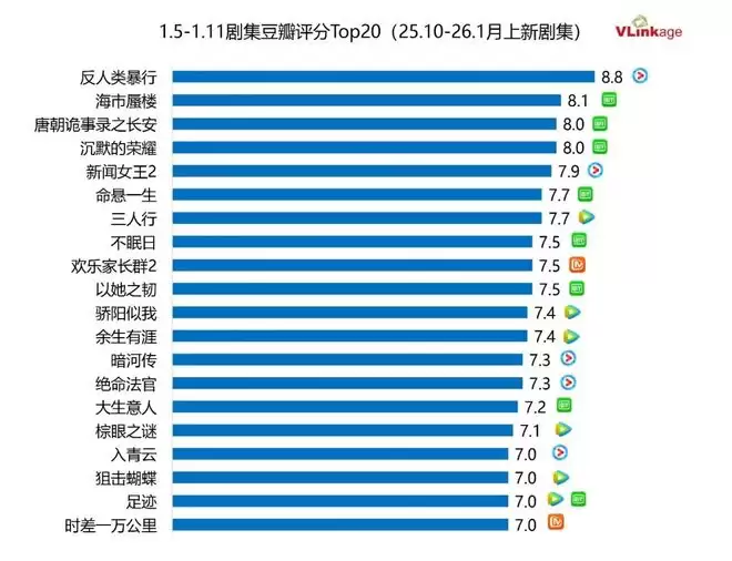 上周剧集豆瓣评分Top20榜单显示,从去年九月至今,共有四部作品豆瓣评分超过8.0分。上周,偶像剧《骄阳似我》豆瓣开分7.4分,成功进入榜单。同时,《狙击蝴蝶》的豆瓣评分也上涨至7.0分,这两部现偶剧均获得了观众较高的满意度。