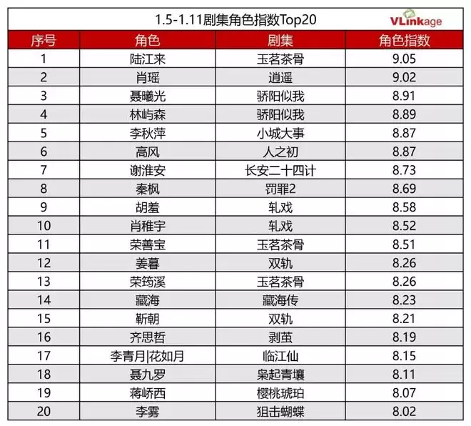 在上周剧集角色指数Top20榜单中,观众认知度最高的角色来自古装剧《玉茉莉骨》的男主角陆江来,以及古装剧《逍遥》的女主角肖瑶。此外,现偶剧《骄阳似我》的女主角聂曦光和男主林屿森,也是上周人气较高的角色。