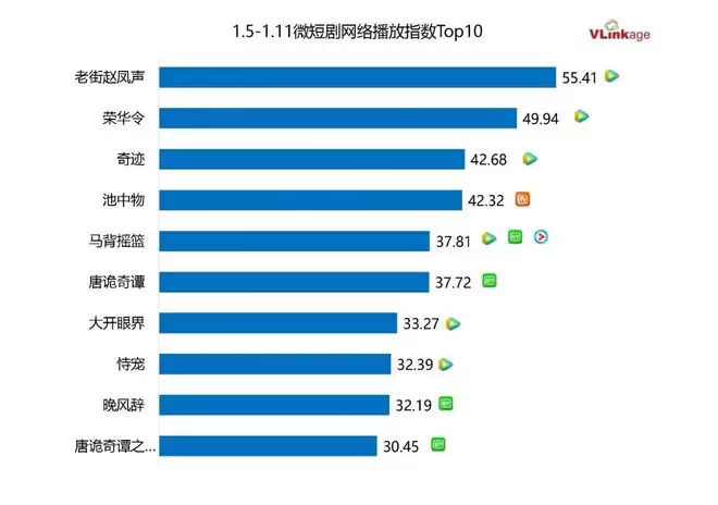 上周微短剧网络播放指数Top10榜单中,热度最高的作品为《老街赵凤声》,网络播放指数稳定在50+量级。新剧《荣华令》表现突出,播放指数直逼50。此外,《奇迹》与《池中物》也是上周表现出色的微短剧,再加上新剧《马背摇篮》与《唐诡奇谭》,微短剧市场呈现出生机勃勃的景象。