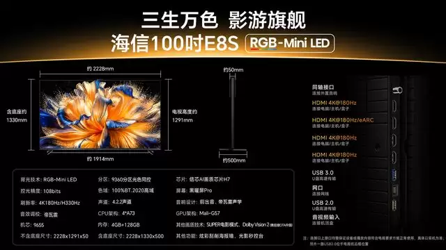 如果说去年的 UX 系列是海信在秀肌肉,展示 RGB-Mini LED 的技术高度,那么今年的 E8S 就是海信的一记“绝杀”。它将 9360 分区、100% BT.2020 色域、H7 信芯 AI 画质芯片、180Hz 原生高刷以及黑曜屏 Pro 等顶尖配置,通过 RGB-Mini LED 技术完美融合,打造出了一款在画质、色彩、游戏性能上几乎没有短板的“六边形战士”。