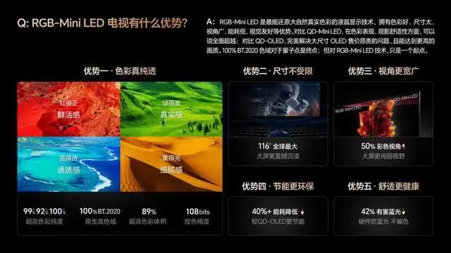 RGB-Mini LED 红绿蓝三色的纯净度极高,画面通透感远超传统量子点 Mini LED 电视。