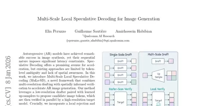 A:MuLo-SD是高通AI研究团队开发的一种新型图像生成加速技术。它采用"先画草图,再添细节"的策略,让AI先用小模型快速生成低分辨率图像,然后用专门的放大器转换成高分辨率预测,最后由大模型验证和修正。这种多尺度协作方式避免了传统方法逐像素处理的低效问题。