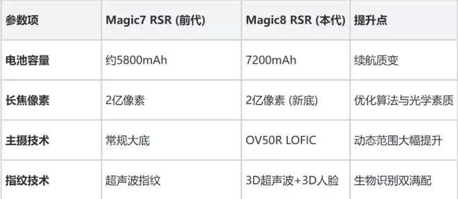 而且通过与前代及同系列产品的对比,我们可以清晰看到荣耀Magic8 RSR的代际跨越。