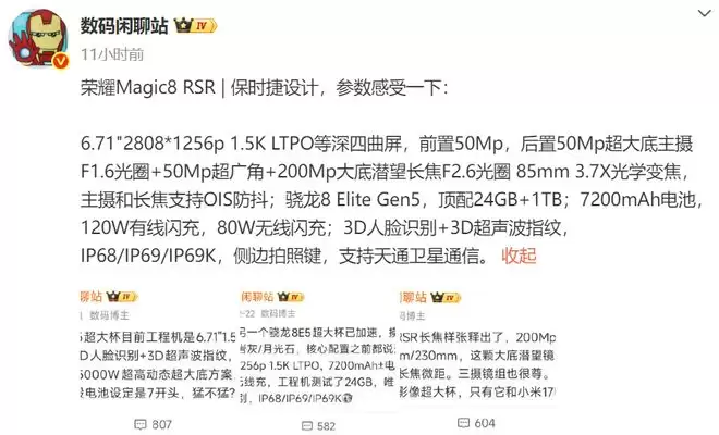 荣耀Magic8 RSR参数曝光:7200mAh电池与2亿像素长焦