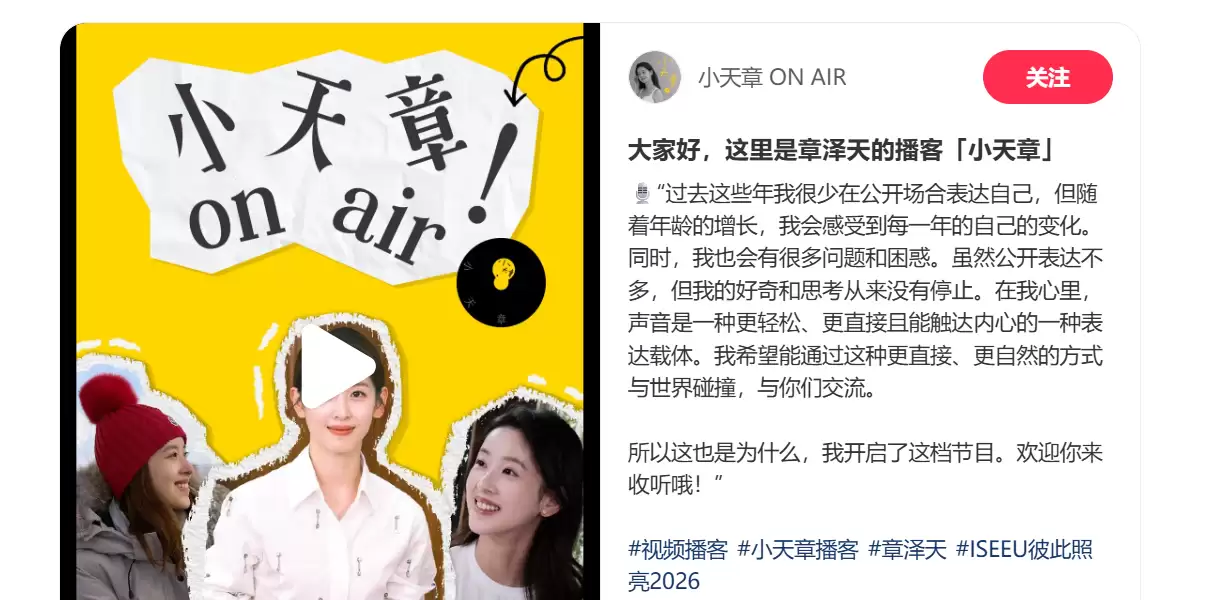 章泽天“小章”播客上线小红书的思考与对话分享
