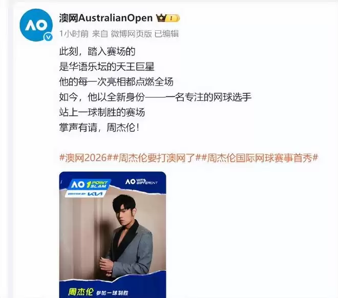 1月12日,周杰伦在个人动态公布自己将以球员身份参加澳网。